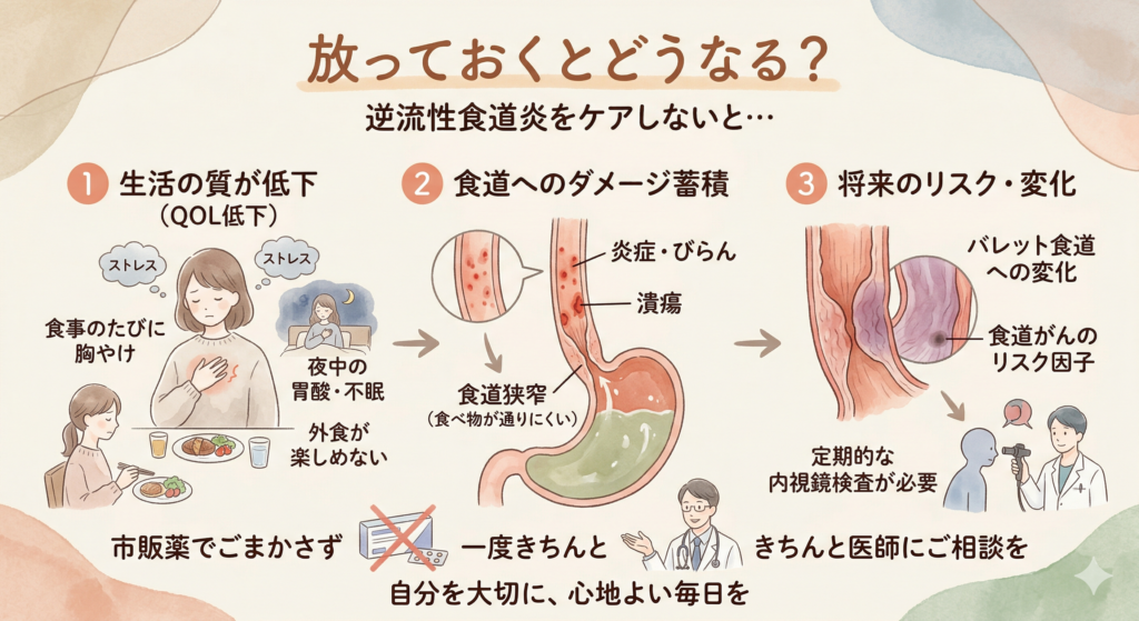 逆流性食道炎は命に直結する病気ではありません。しかし、症状を放置しているとさまざまな問題が積み重なっていきます。